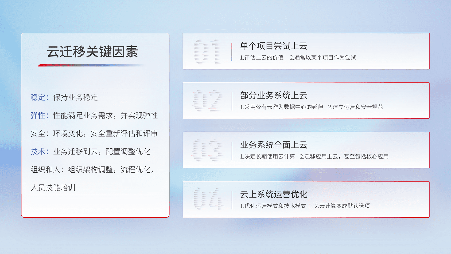 结合实际业务,,,从规划设计、、云平台选型、、云原生改造、、、数据迁移、、、集成交付,,,迁移全过程为客户识别最佳上云路径,,做好风险识别管理,,,设计网络架构、、、身份权限、、、、安全审计合规、、、、操作审计、、日志审计、、、、监控告警策略、、、、多站点容灾设计等,,,,对云上基础设施进行整体规划,,,提升IT治理水平,,,以满足弹性、、、高可用、、高性能的需求。。