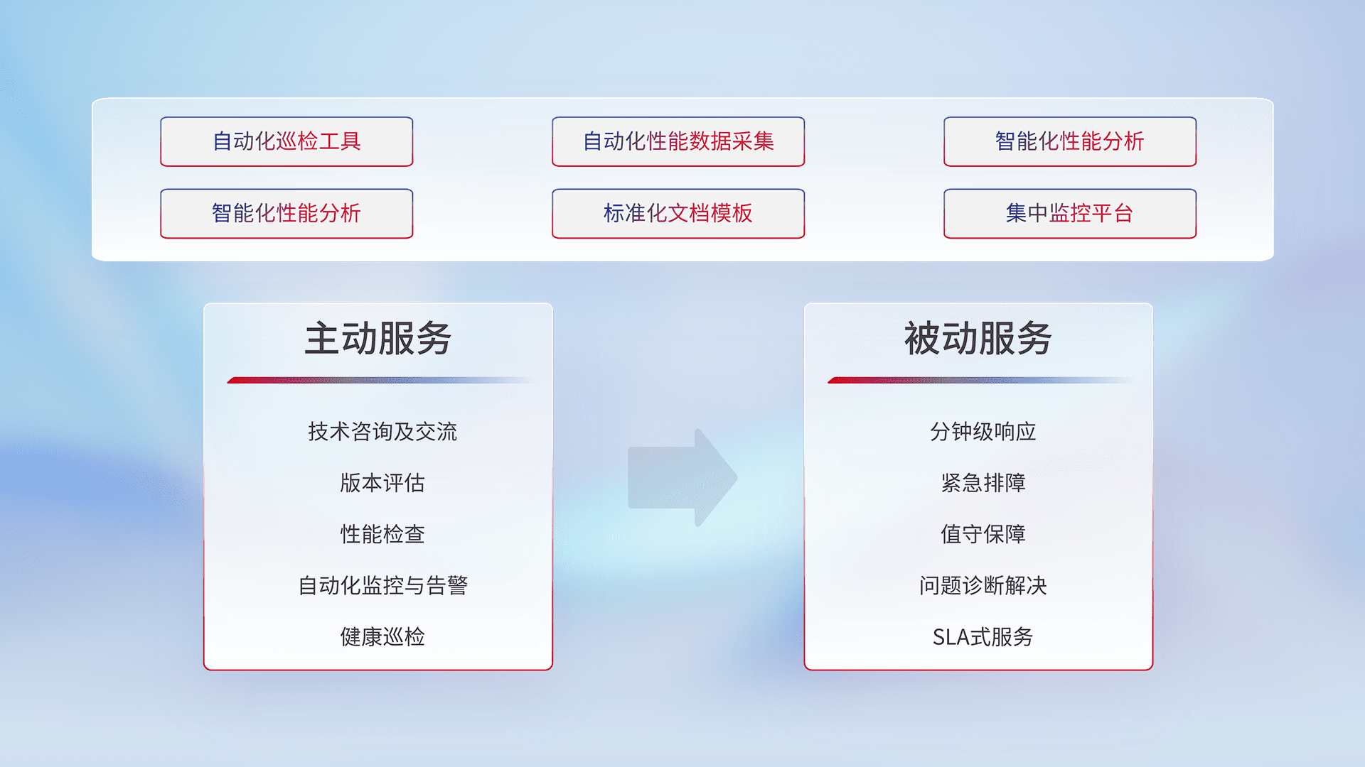 智能化工具和标准化文档,,,保障服务质量,,提供主动服务(包含技术咨询、、、、版本评估、、性能检查、、自动化监控与告警、、健康巡检)和被动服务包含(分钟级响应、、紧急排障、、值守保障、、、问题诊断解决、、、、SLA服务)。。。。